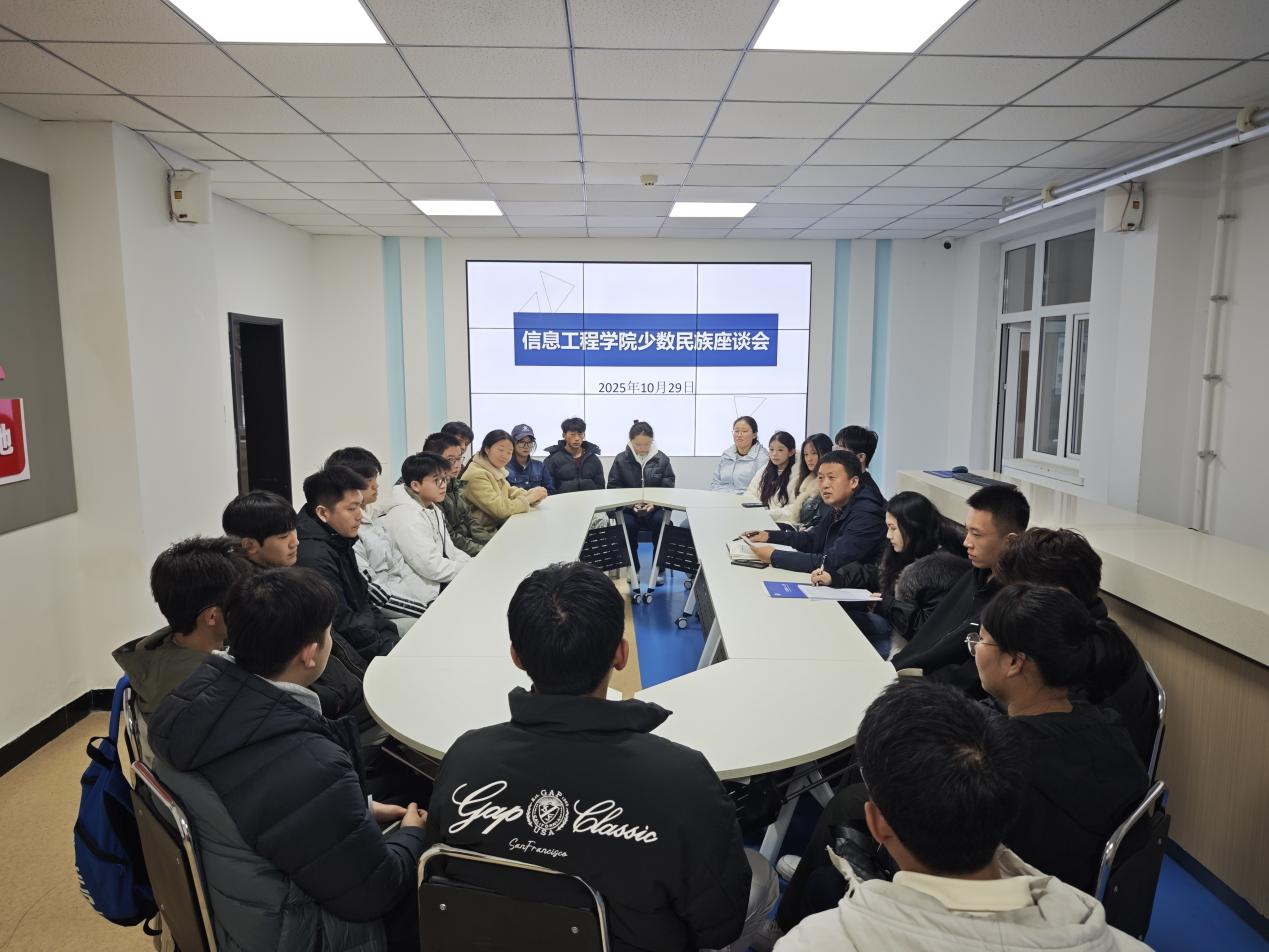 为深入学习贯彻习近平总书记关于加强和改进民族工作的重要思想,铸牢中华民族共同体意识,精准对接少数民族学生成长发展需求,10月29日下午,信息工程学院在学校“一站式”学生社区召开少数民族学生代表座谈会,学院党委书记梁洪以及本科和研究生各年级学生代表参加会议,会议由2025级本科生辅导员岳丹丹主持。