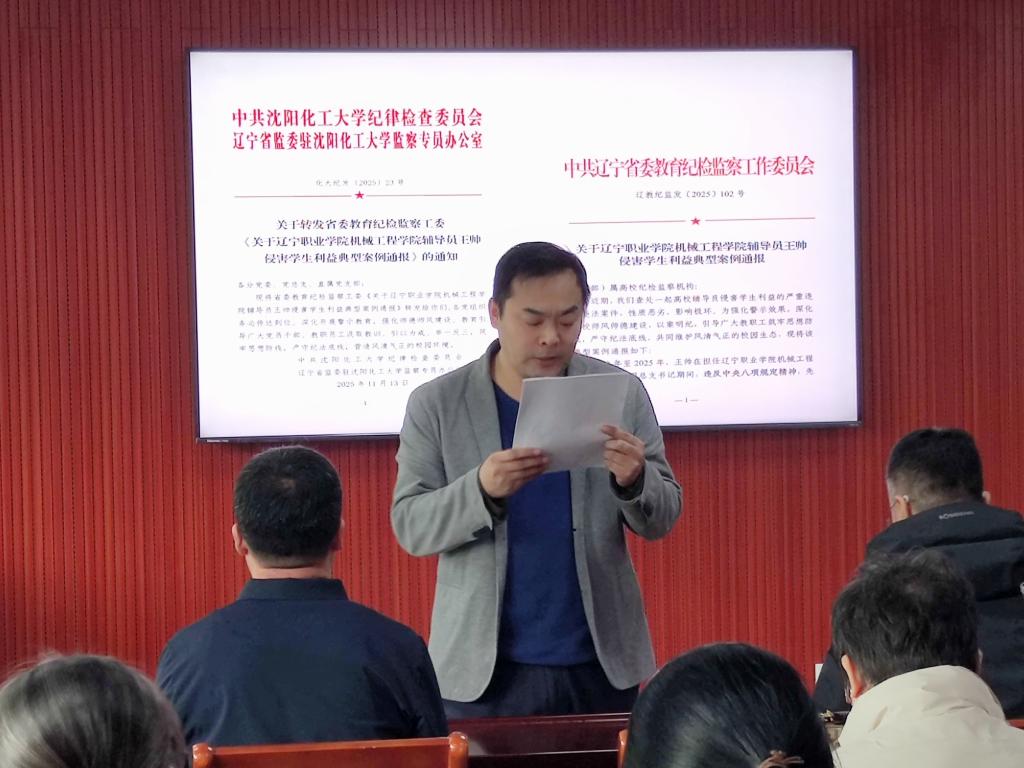 在会上,学院纪委委员蔡庆春传达学校《关于转发省委教育纪检监察工委<关于辽宁职业学院机械工程学院辅导员王帅侵害学生利益典型案例通报>的通知》(化大纪发〔2025〕23 号)文件内容。