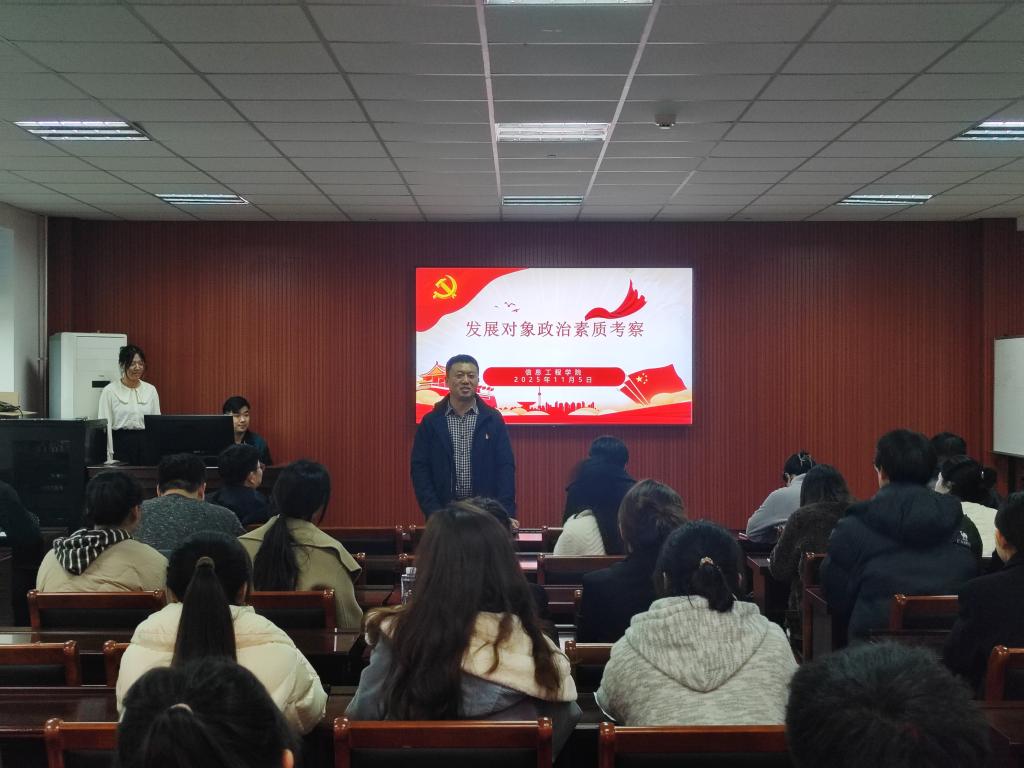 为切实加强党员发展工作,严格考察入党发展对象的政治素养和综合表现,11月5日,信息工程学院党委召开发展对象政治素质考察会议。考察组成员由马克思主义学院卢春艳老师、学院党委委员、辅导员、组织员和学生党员代表担任,对36名入党发展对象进行全面、严格的考察,学院党委书记梁洪主持会议。